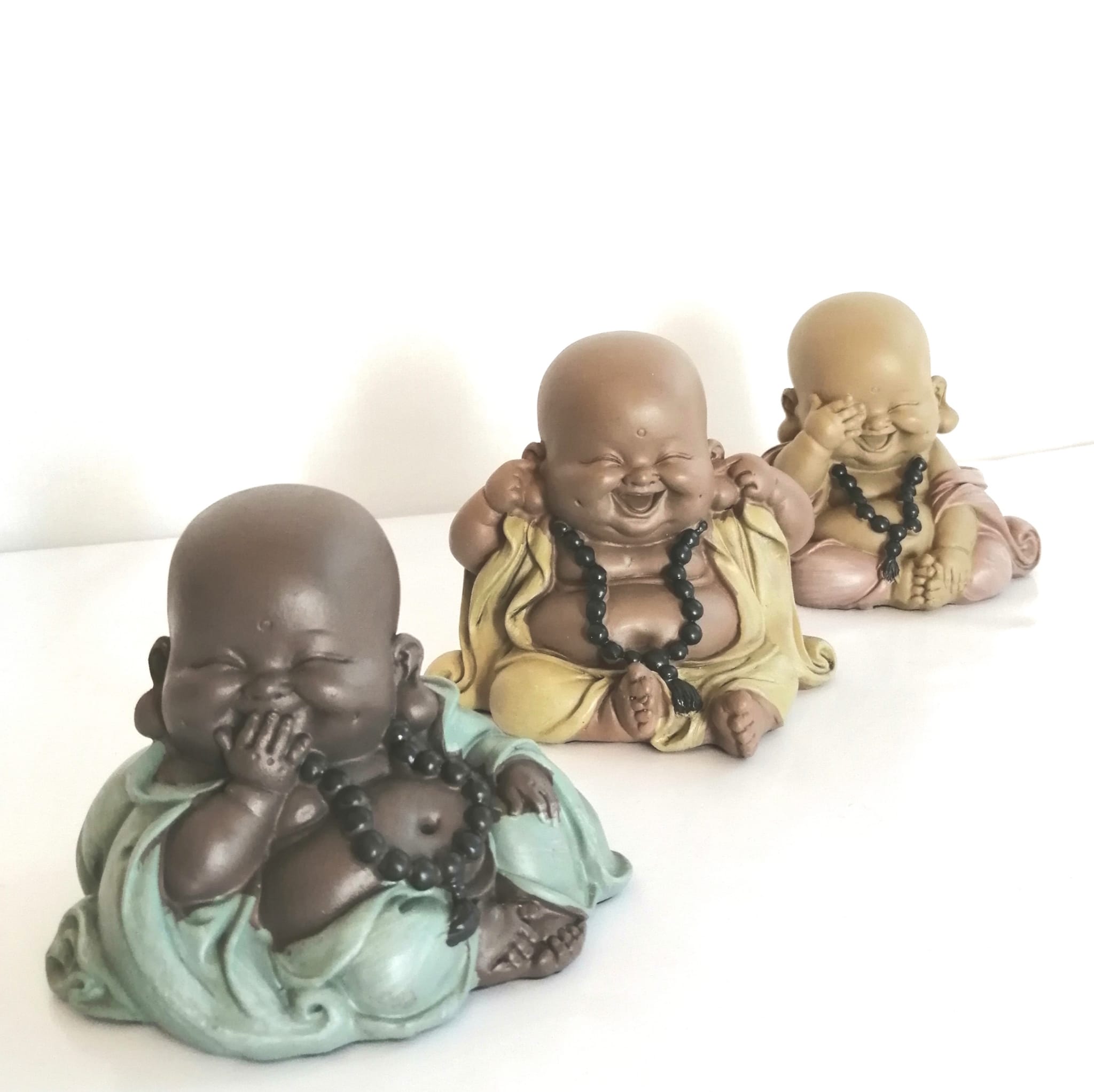 set de tres niños budas no hablo, no escucho, no oigo, pequeñas esculturas en resina, un toque oriental con historia y regalo original, inspirado en los monos japoneses que están representados en una talla de madera en el santuario de Toshogu, en Nikko, Japón. Una de las interpretaciones de estos símbolos es para llegar a la sabiduría: NEGARSE A ESCUCHAR MALDADES; NEGARSE A VER MALDADES; NEGARSE A DECIR MALDADES; al mirarlos recordamos que la vida nos llega por estos sentidos y la interpretación la tenemos que recoger de la mejor forma, escuchando, mirando, y hablando siempre en positivo. Los Tres monjes o budas Sabios o Místicos, que se tapan con las manos respectivamente los ojos, oídos y boca, tiene muchos significados pero la historia más extendida es la que interpreta los símbolos para llegar a la sabiduría.