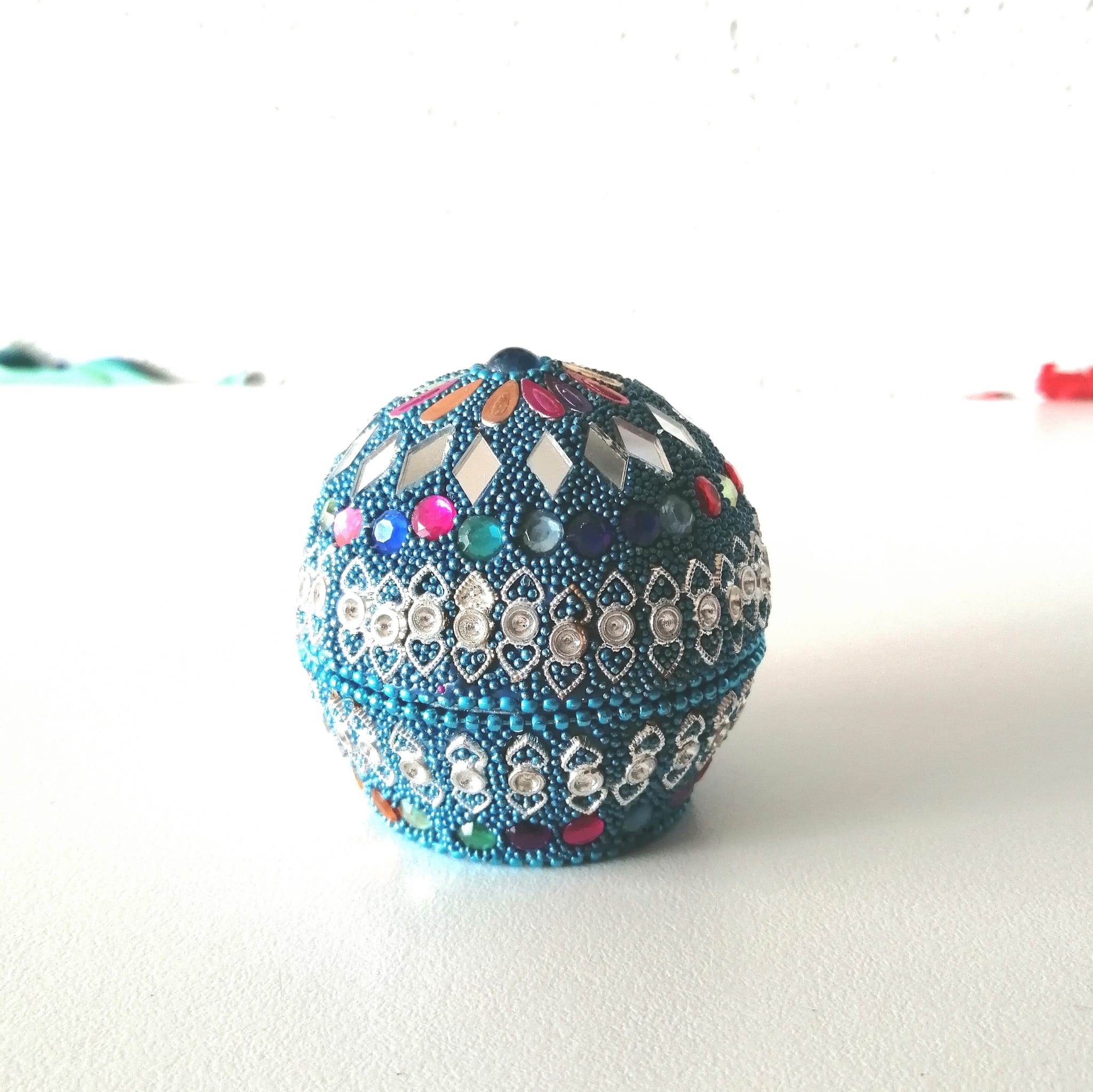 Precioso joyero de colores vivos decorado con espejos, piedras de diferentes colores, detalles con corazon, en forma de esfera, Redondos.