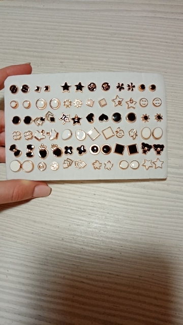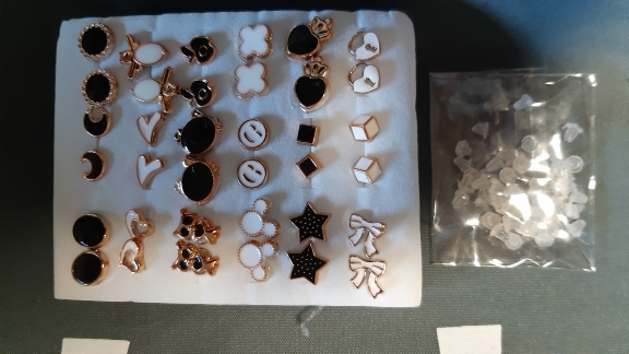 Cuando pedí los pendientes, estaba listo para que después del calcetín los oídos fueran negros (reacción a la joyería), ¡pero no! ¡La uña en sí es de plástico! Lo cual es muy cómodo! P.S2 se regalaron un par de corazones, por lo que en la foto no viene todo el Kit)